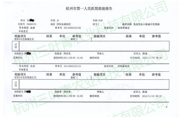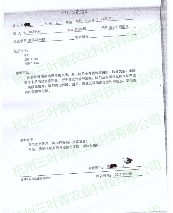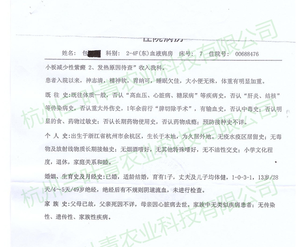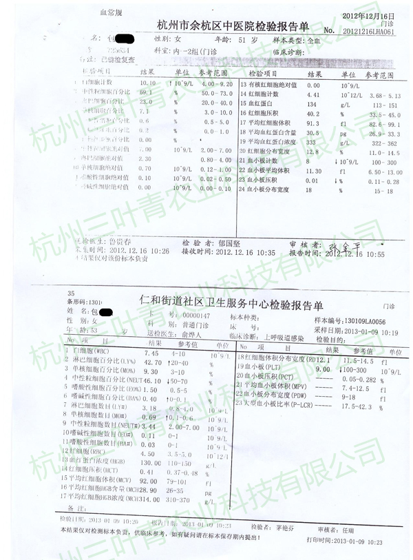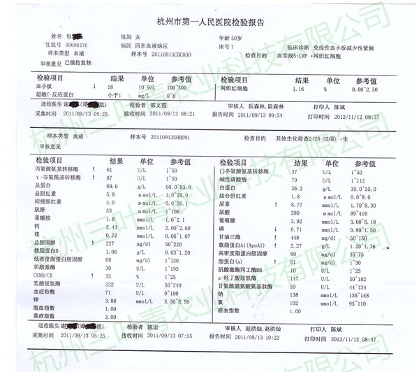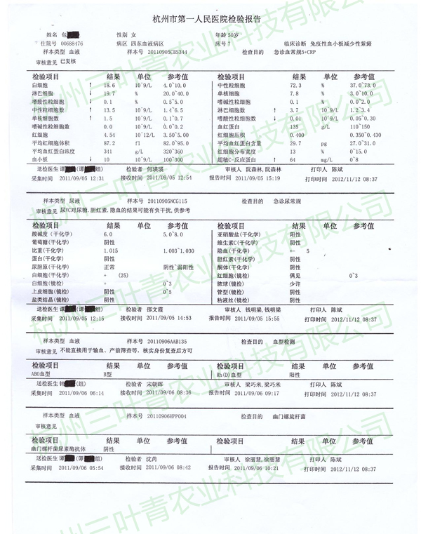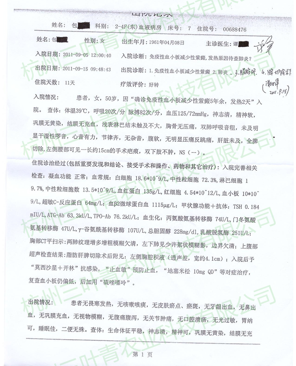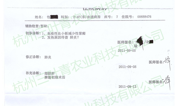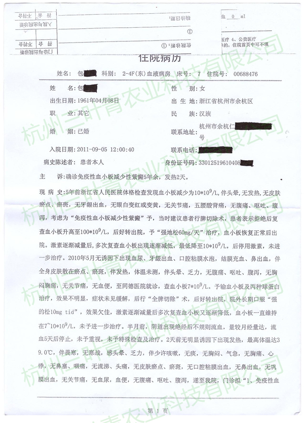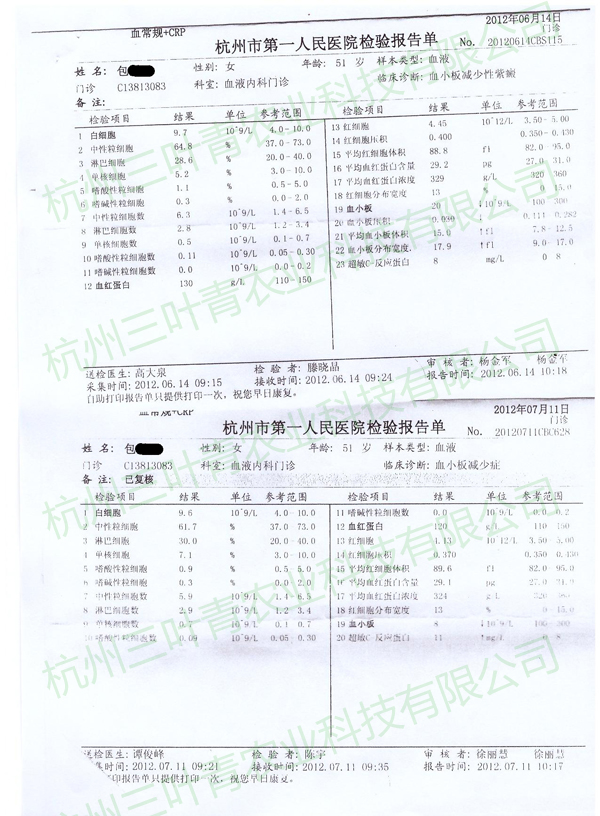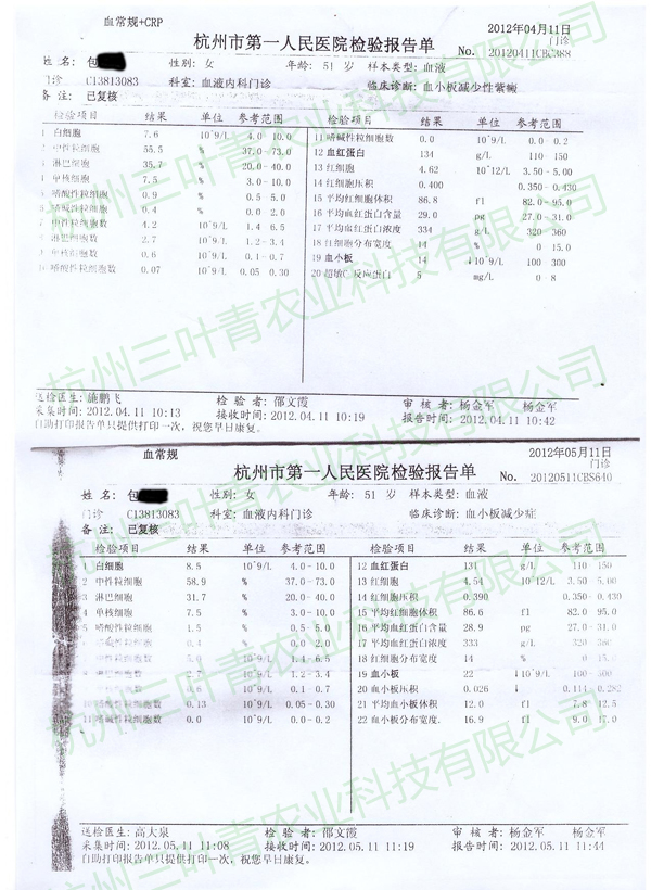 包某某,女,1961年出生,2006年因免疫性血小板减少性紫癜与肺炎症状住院检查,未行手术,直至2010年五月因相同症状再次入院,行全脾切除术。出院后虽长期服药,但效果欠佳,血小板维持在较低水平, 2011年8月重又因发热、头晕、乏力等症状再次入院。之后,患者开始服用三叶青进行调理、治疗,血细胞各项指数均趋向正常方向发展,直至出院时各项情况均恢复稳定,患者精神良好,在2013年初的复诊中亦再无病情变化。