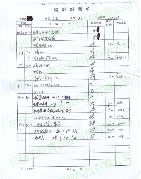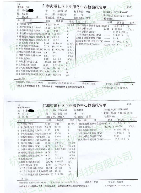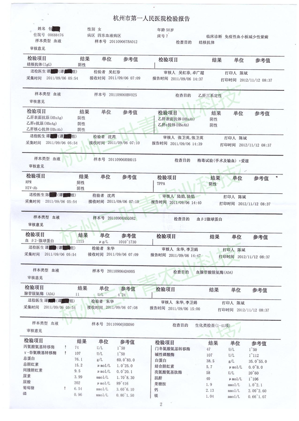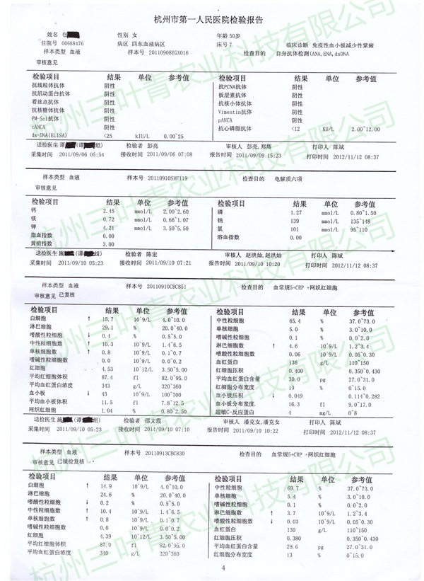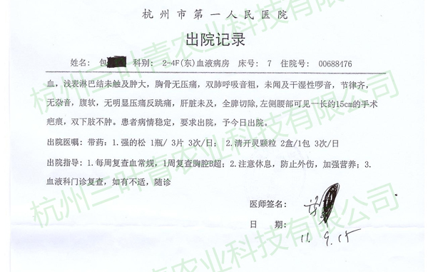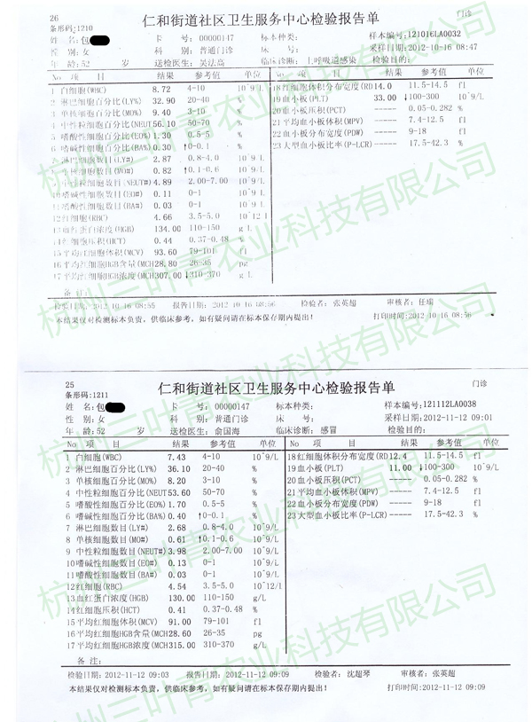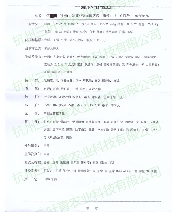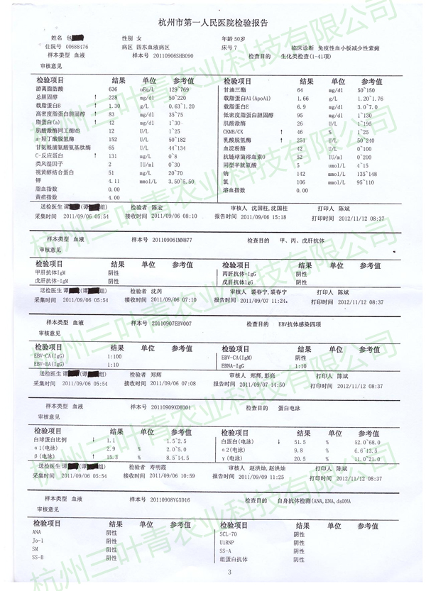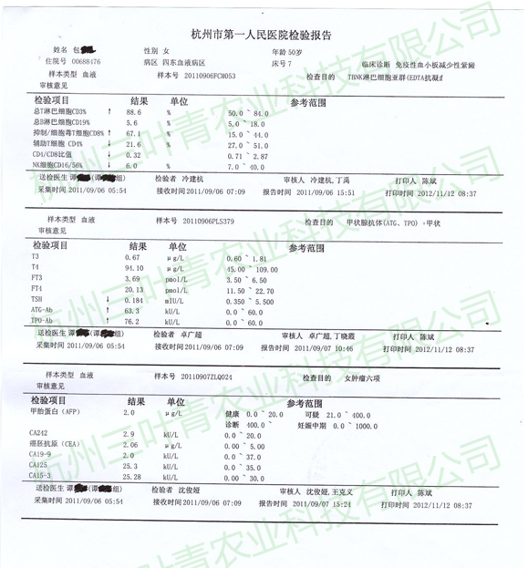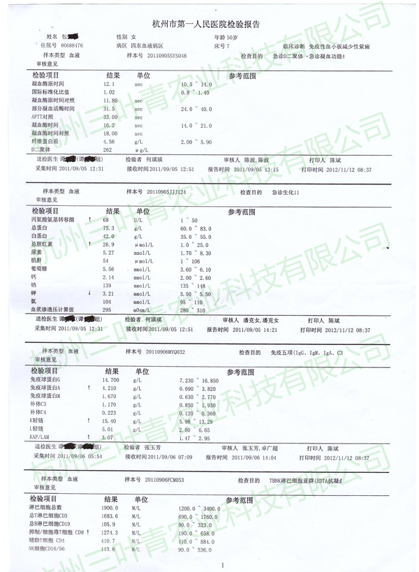 包某某,女,1961年出生,2006年因免疫性血小板减少性紫癜与肺炎症状住院检查,未行手术,直至2010年五月因相同症状再次入院,行全脾切除术。出院后虽长期服药,但效果欠佳,血小板维持在较低水平, 2011年8月重又因发热、头晕、乏力等症状再次入院。之后,患者开始服用三叶青进行调理、治疗,血细胞各项指数均趋向正常方向发展,直至出院时各项情况均恢复稳定,患者精神良好,在2013年初的复诊中亦再无病情变化。