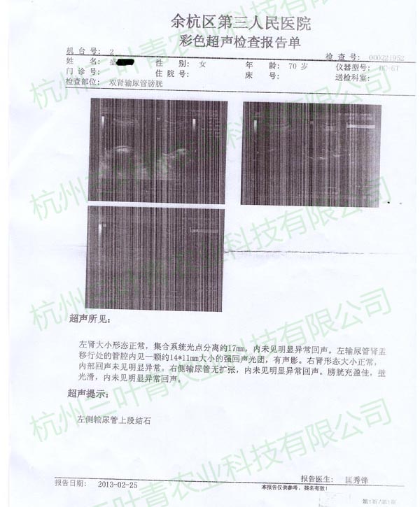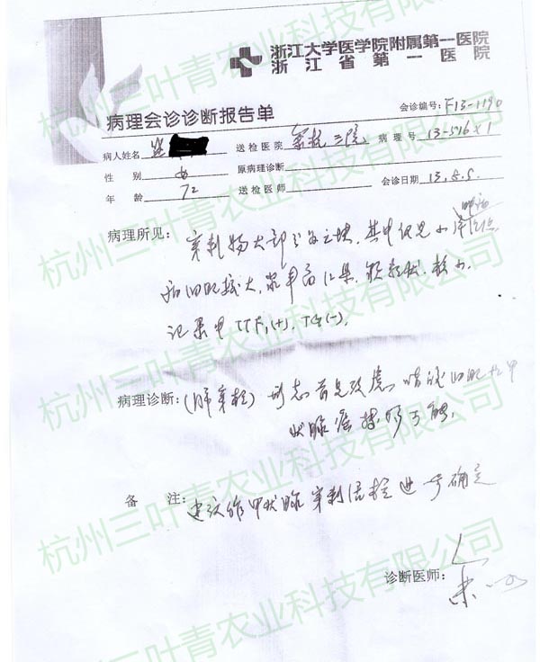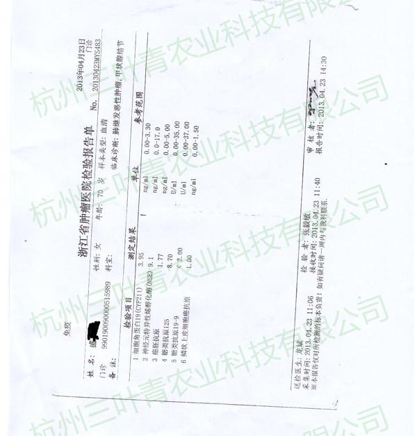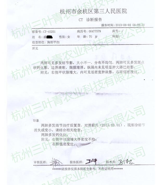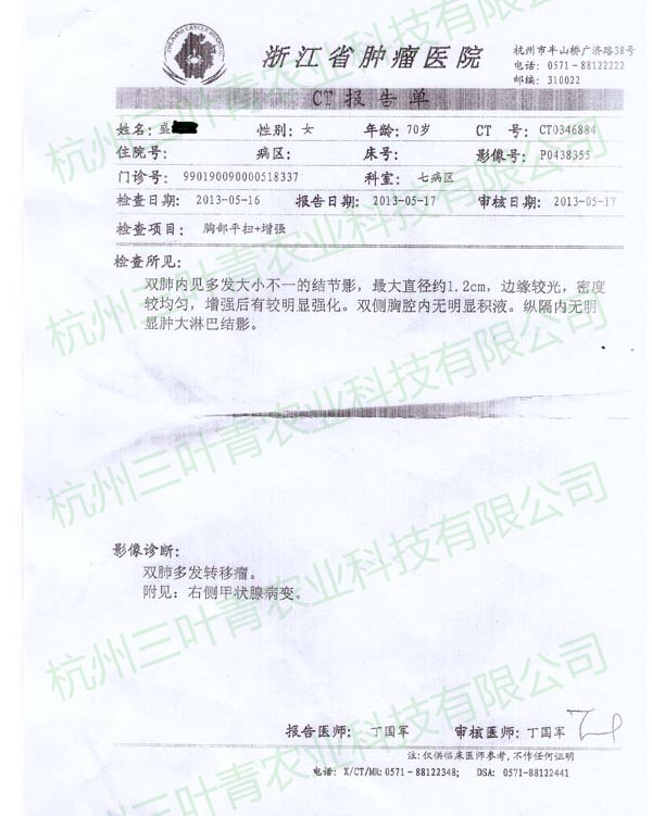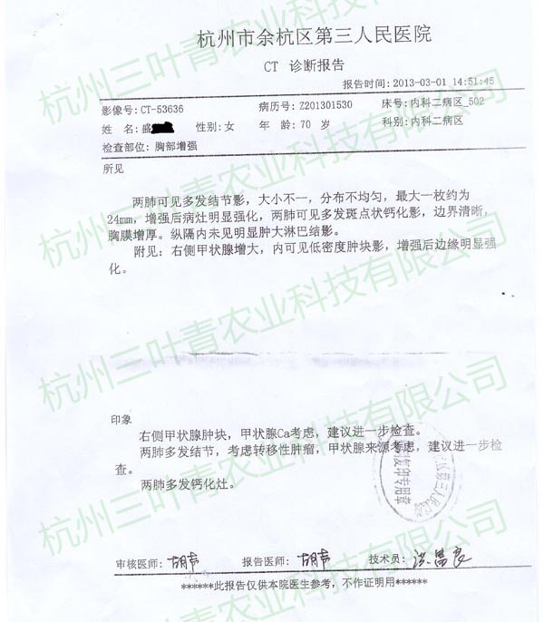 盛某某,女,72岁,在2013年初进行肿瘤相关检查,穿刺及CT扫描均显示双肺多发结节,疑为甲状腺肿瘤转移而来,且锁骨上亦有淋巴结出现,右肝现低密度灶。之后开始服用三叶青,并伴以其他治疗,在8月的复查中发现原本位于两肺的多发钙化结节均消失或变小,同时锁骨处淋巴结状况好转,几近恢复正常人水平。三叶青的效果可以说创造了一个奇迹。