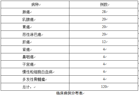 浙江省中医药研究院国家级名中医,全国五一劳动奖章获得者魏克民教授用了八年时间完成了浙江省经贸、浙江省中医药管理局立项的《中药三叶青抗肿瘤作用机制的实验研究》2006年3月至2007年3月对120例服用浙江三叶青的恶性肿瘤病人进行临床观察,病例分布如表所示: